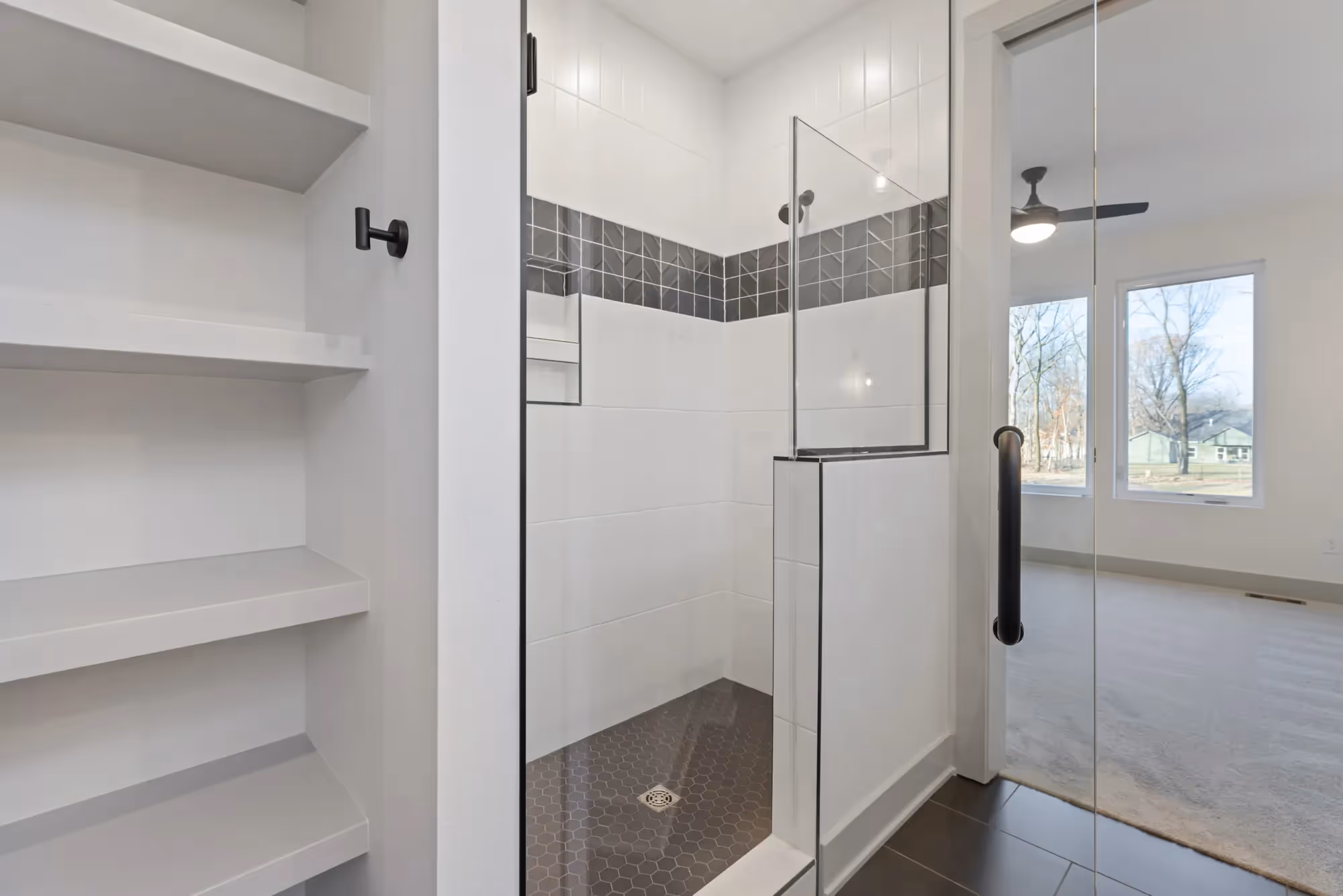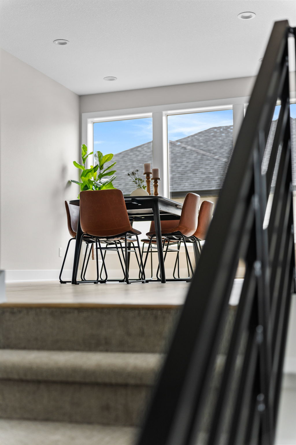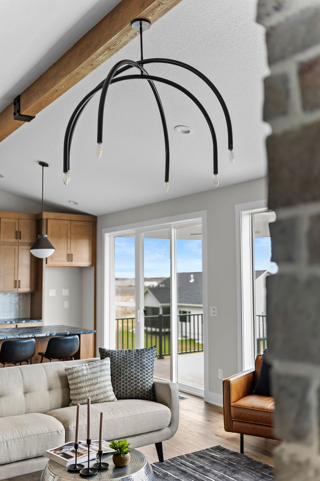 The Gear plan is an updated twist on open concept with a separated dining space. This 2800+sf plan is packed with all the must haves-natural light from every direction with large windows, vaulted ceiling in the kitchen & dining, statement fireplace, walk-in pantry with cabinetry & custom shelving and a relaxing soaker tub in the primary suite.